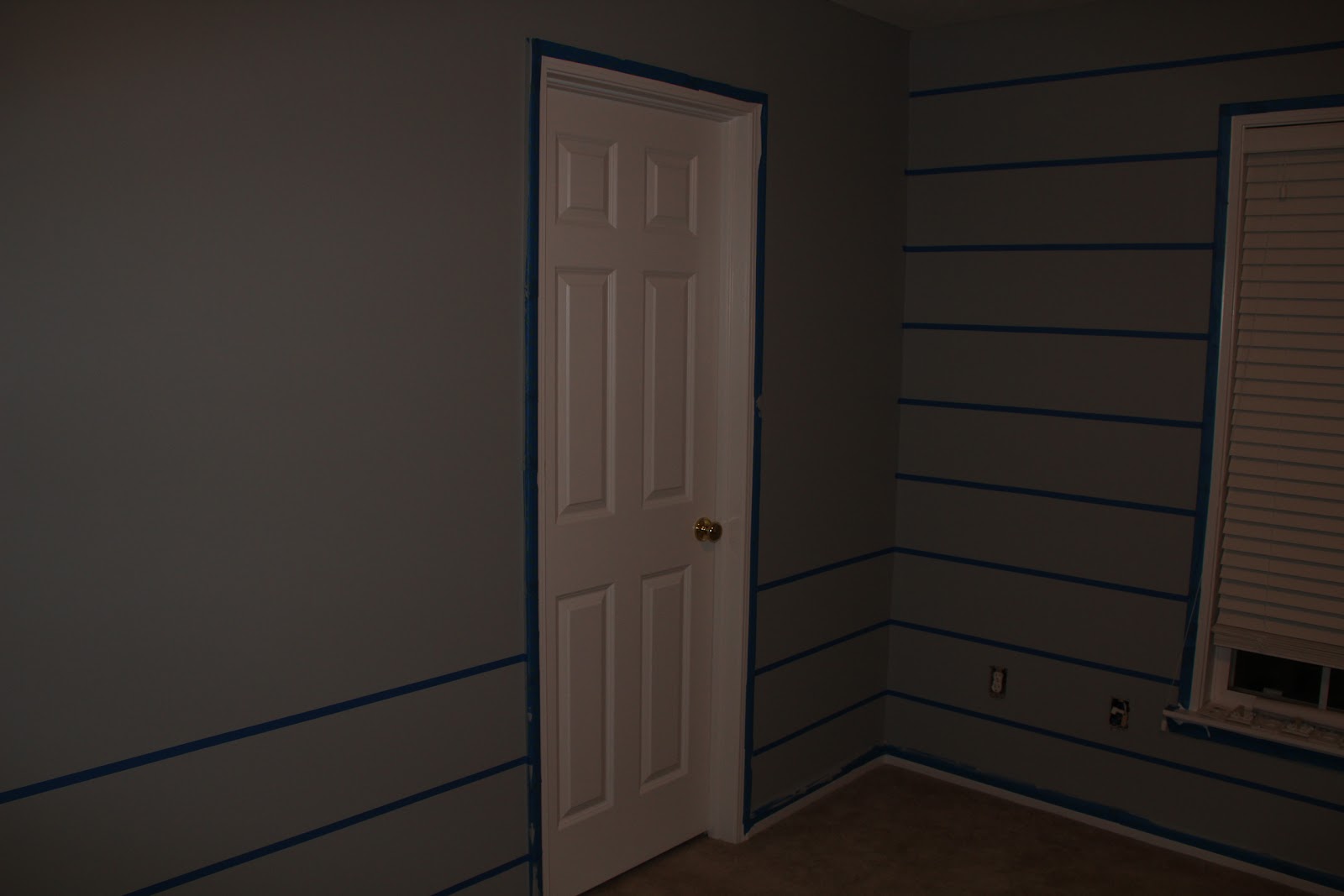 First step:We used a laser level with an adapter to shoot the laser as a horizontal line. Then just follow the lines with the tape. Hallway door and closet on the left.